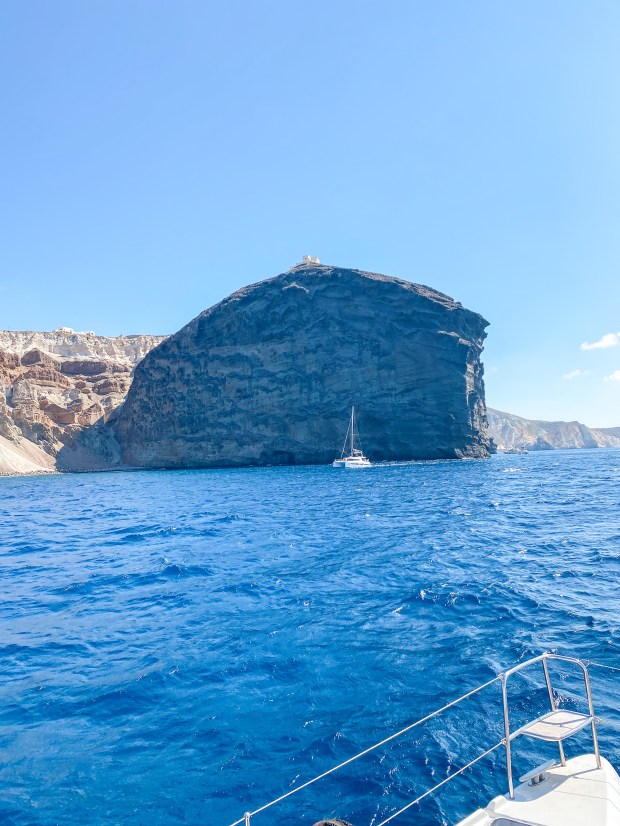 The Agean Sea is a gorgeous navy blue color that has a little sparkle to it. We went in the beginning of September so the water was slightly cold but still warm enough to where you could enjoy it. The caldera is a white colored rock and it gets its shape due to the earthquakes and volcanic eruptions that have happened throughout history. I highly highly suggest booking a catamaran tour before your trip. Being able to sail the sea and see multiple parts of the island from out in the water is a memory and feeling you’ll never forget. We booked our catamaran tour through Get Your Guide, which you can find linked here. The process was so simple, you just show up to their office and they take it from there. All you have to do is sit back, unwind and enjoy yourself.