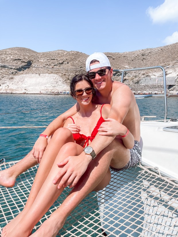 Our second day in Santorini we went on a catamaran tour! We sailed the Agean Sea and went to several private beaches. Our first stop was at a hot spring that would turn your white bathing suits dark! Luck for us, we weren’t wearing white.. but keep this in mind when you’re packing for your trip. We got to jump off the boat and actually swim in to the hot spring, which we determined was warm but not actually hot. While the boat sailed the sea we were also served wine, charcuterie snacks, and a full lunch. It was a gorgeous day, the weather was perfect, and seeing the caldera from out in the water was so serene. This was definitely the best way to start our four day trip in Santorini.