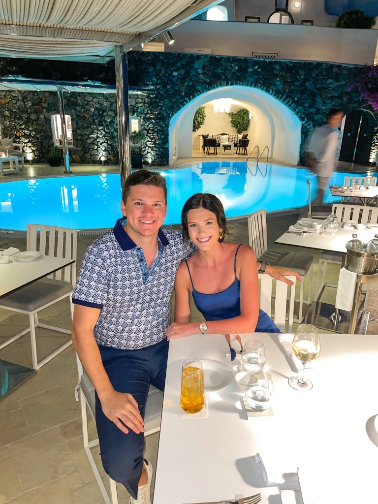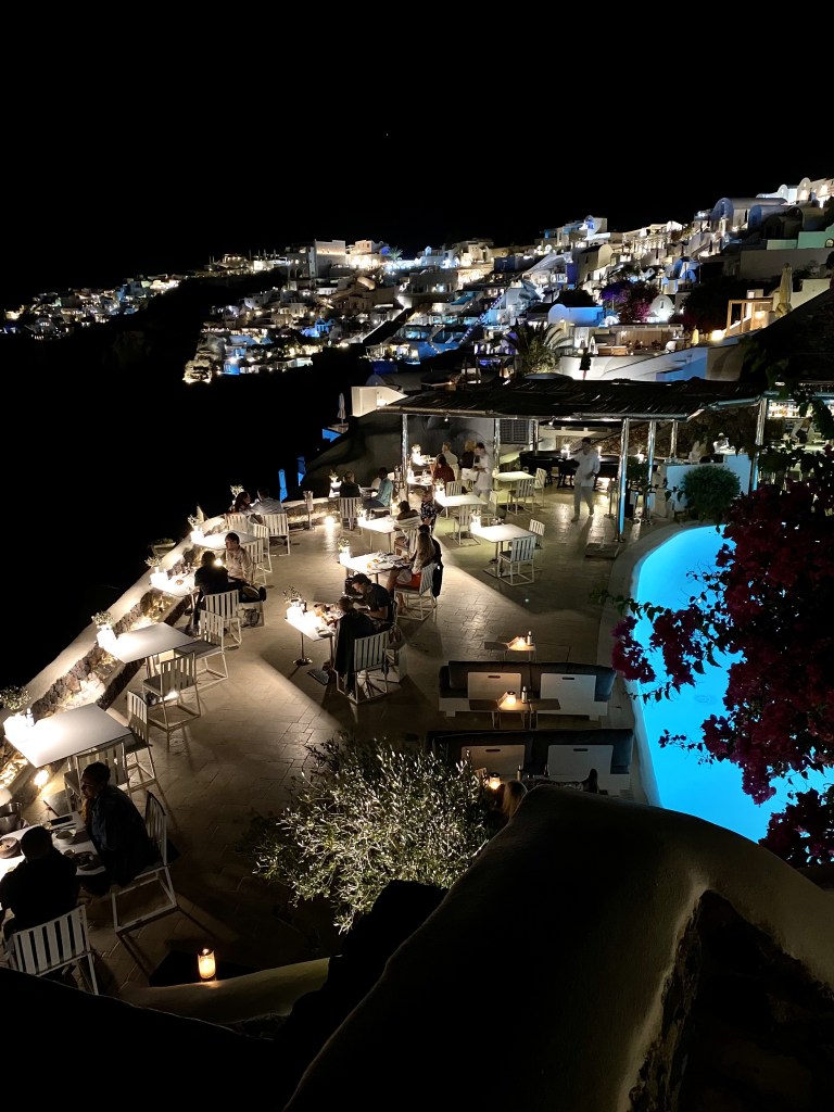Next up on the list of restaurants we chose to eat at is Petra. This was the most romantic dinner we had during our trip. The restaurant is slightly hidden because it’s actually located in the Canaves Oia Suites. We had to walk down this small flight of stairs to find it, but then all of a sudden we were hit with so much beauty and intimacy. The restaurant is alongside this perfectly lit light blue pool that just glistens in the moonlight. The tables are set for two overlooking the Sea and depending upon the time of day, it’s the most enchanting way to watch the sunset. If you’re celebrating a special occasion or just want a magical evening full of love, Petra is my number one recommendation.