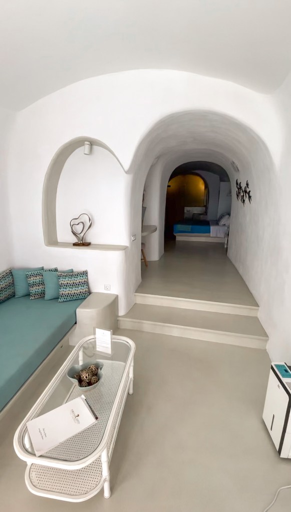 When we landed in Santorini, we took a taxi to our first hotel, Thirea Suites. Since Santorini is built on the caldera, the roads are at the top and you have to take these stairs down to the bottom of the caldera where your room is. The staff at Thirea Suites were extremely kind and very welcoming. They have bellhops who will help carry your luggage up and down the stairs for you, so that was a lifesaver! It’s free of charge, but of course tips are welcome!